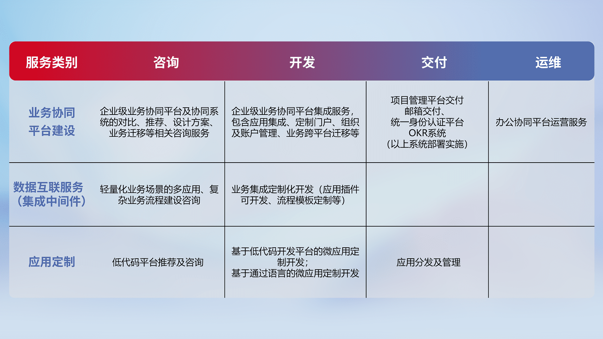 针对钉钉、、、企微、、、、IDaas等平台级产品提供产品的规划、、方案、、交付、、定制化开发等服务,,实现如统一协同办公、、智能客户服务、、混合会议管理、、智能数据查询、、等业务场景,,,实现数字化转型。。。。